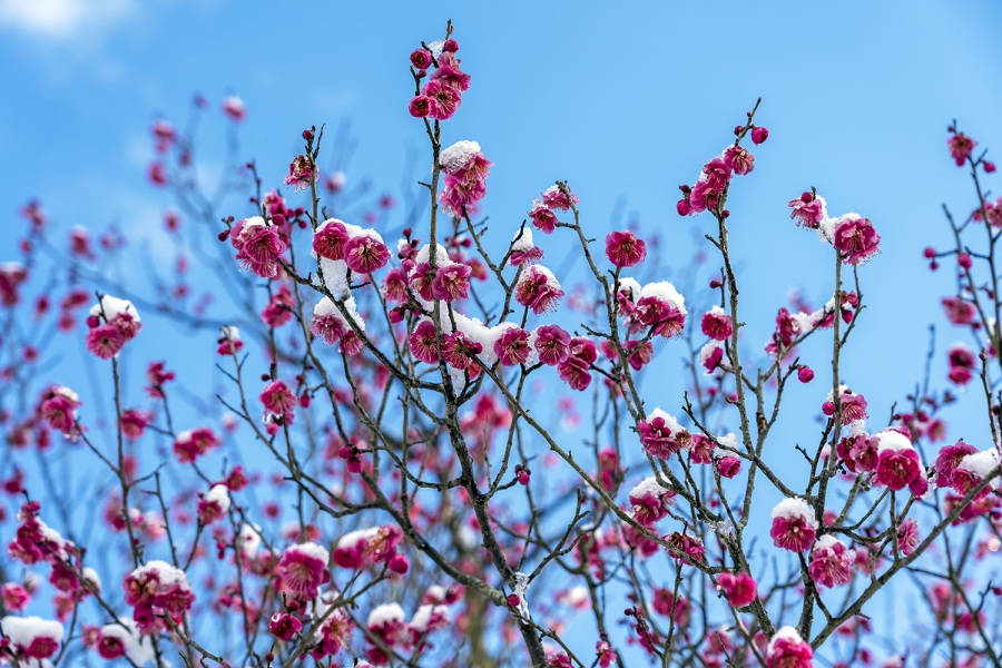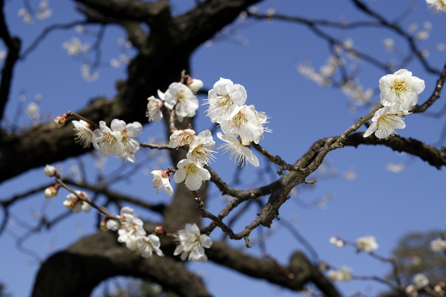 ・ウメ(梅:早咲きの八重寒紅をはじめ、兼六園の梅林ではさまざまな品種のウメが咲く)