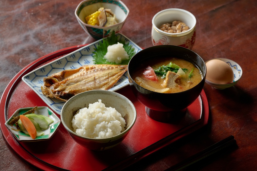 精米したての銅釜炊きのご飯、具材をたっぷりと盛り込んだ味噌汁を、自家製の漬物とともに。主菜は地魚の自家製干物、または信州味噌を使った鶏の味噌漬け焼きなどからお選びいただけます。
