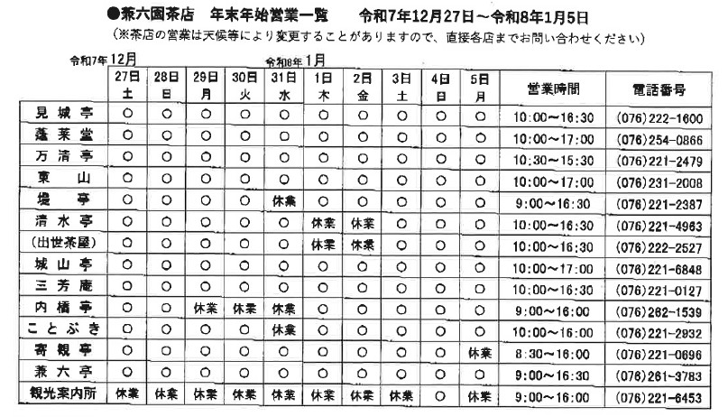 ・時雨亭(兼六園)、玉泉庵(金沢城公園)は12月29日~1月3日休み