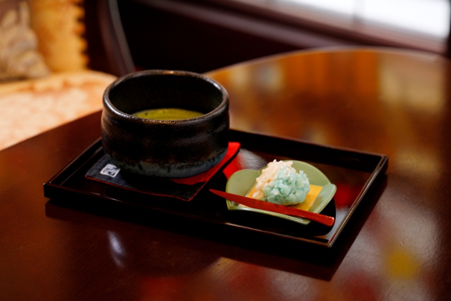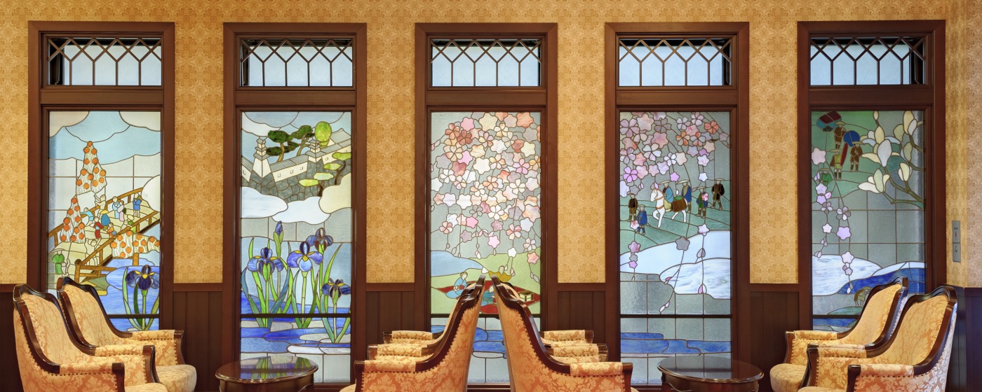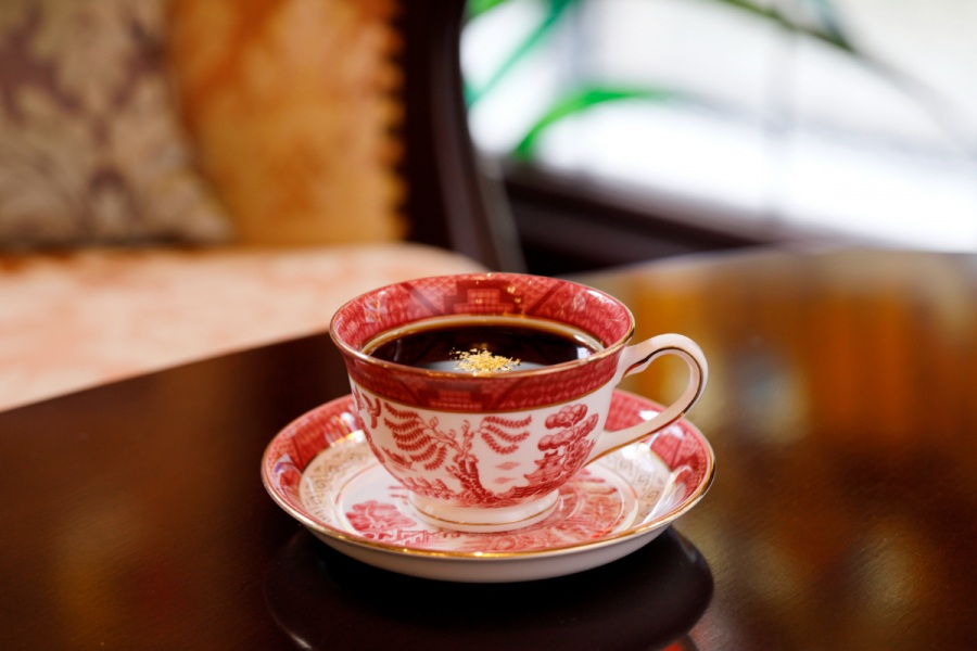 「金沢白鳥路 ホテル山楽」の1階ロビー奥にあるロビーラウンジ。瀟洒な赤絨毯やステンドグラスが配され、大正ロマンの情緒を漂わせる空間では、どこか懐かしい「クリームソーダ」や金箔を浮かべた「金箔ブレンドコーヒー」のほか、菓子処「吉はし」の上生菓子などを味わえます。夜はピアノの生演奏が流れるバーとしても楽しめます(休みの日もあり)。