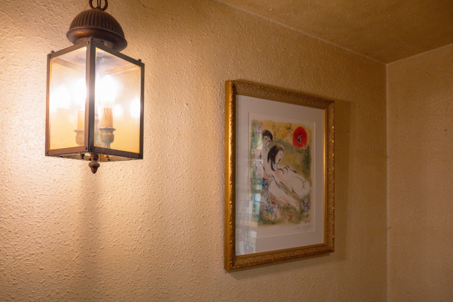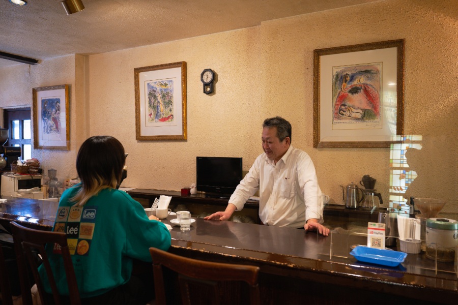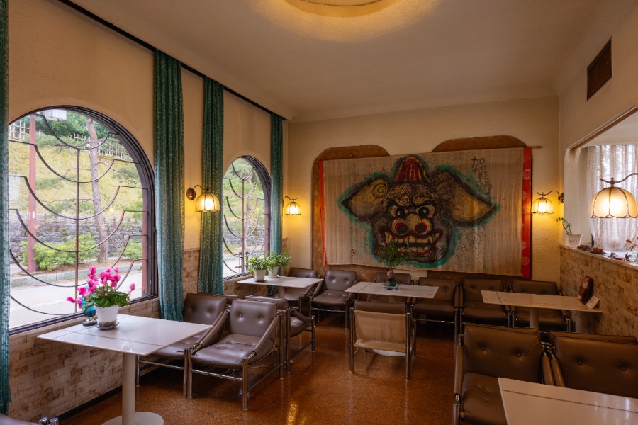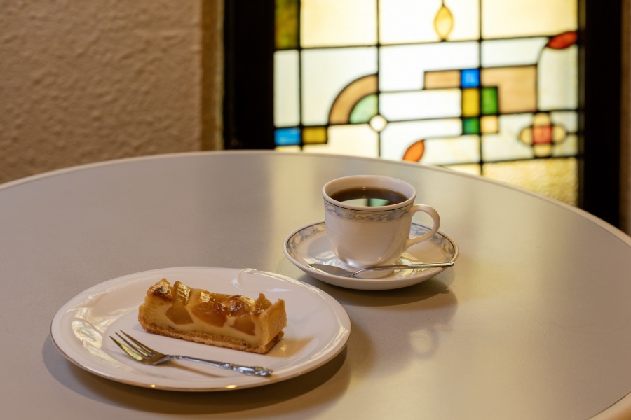 尾張町にある「ギャラリー三田」の昭和ロマン漂う建物に併設。国の登録有形文化財である建物の店内には、昭和初期の貴重なステンドクラスやシャガールの絵画が飾られた贅沢な空間が広がります。気さくなマスターとの会話とともに、淹れたてのコーヒーを片手に心地よい時間を過ごせるとあって、長年の常連客はもちろん、県外からも多くのファンが訪れています。