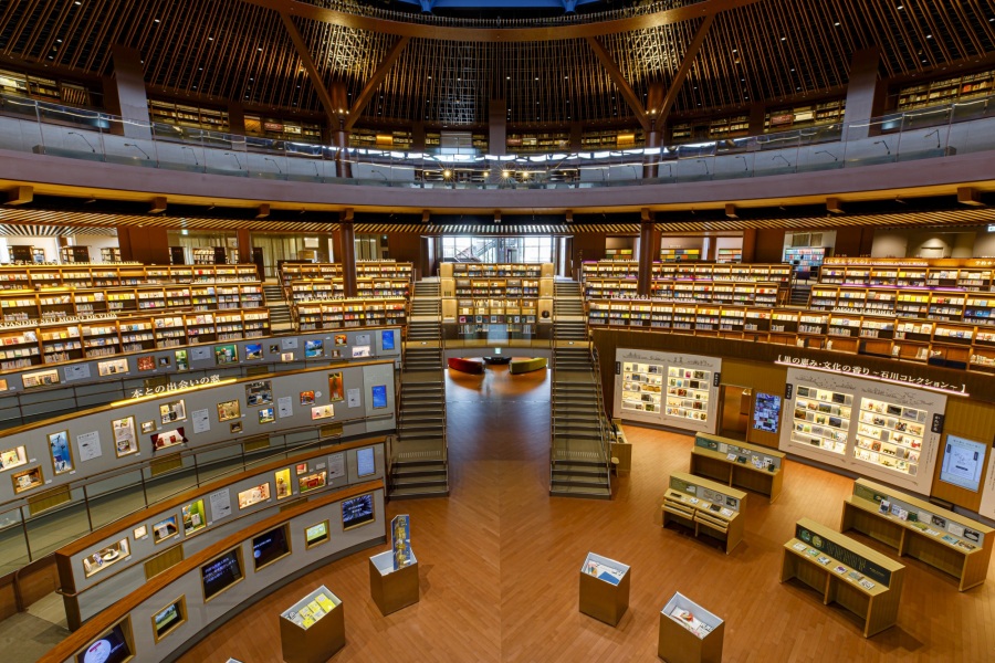 「石川県立図書館」は”思いもよらない本との出会いや体験によって、自分の人生の1ページをめくることができる場所”として2022年に移転開館。メディアやSNSでも話題です。天井から降り注ぐ明るい光が円形の大きな吹き抜けを照らす光景は圧巻で多くの来館者がスマートフォンなどで写真を撮影しています。カップルで来館している方も散見されます。