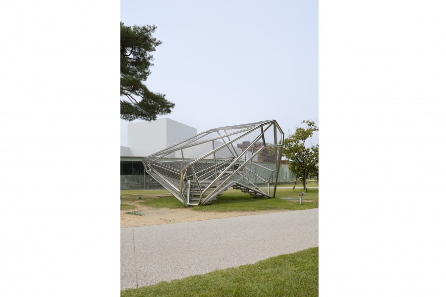 同じくSANAAによるデザインのドロップチェアは外に置いてあり、鏡面に磨かれた座面に周囲の風景が映る。雨粒のようなフォルムからドロップと名付けられた。ちょっと腰掛けるのにちょうどいい小ささで、外で小休止のために座っている人が多く見られる。