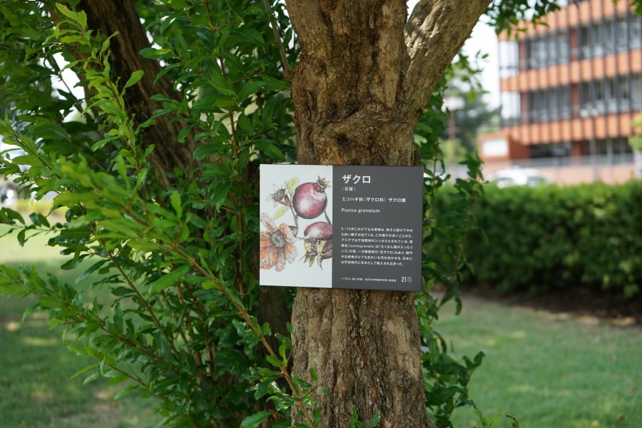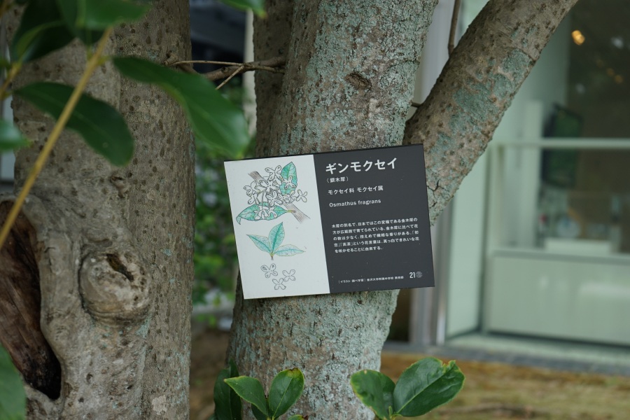 敷地内の木々は、すべて小中学校時代のものがそのまま引き継がれている。よくみると、木それぞれに絵と解説のプレートが掲げられている。これらは後輩にあたる、現役の金沢大学付附属中学校の美術部員たちが描いたもの。美術の種はきちんと引き継がれている。