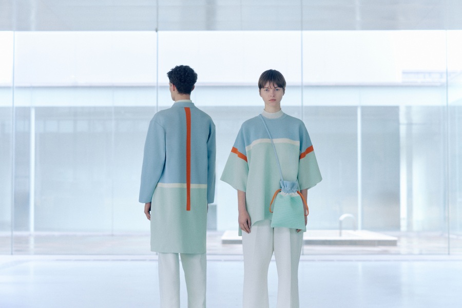 再生素材など、サステナビリティへ積極的に取り組む高橋氏らしく、再生ポリエステルなどを使用。美術館のガラスの雰囲気に合うブルーを基調にしている。
