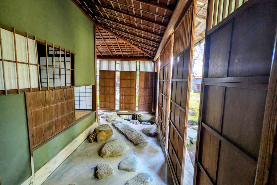 ・中間スペース「土縁(どえん)」が生み出す実用美:「土縁(どえん)」とは、土間に面した縁側空間のことで、外側の板戸の開け閉めで、「屋内」にも「屋外」にもなる「中間のスペース」としての役割を持っています。茶道が盛んな金沢では、飛び石や手水鉢を設えて「露地」の役割を持たせ、雪や雨の日には、土縁の外側の戸を閉めることで、露地の情緒を楽しみながら濡れることなく移動できる実用的かつ風雅な設計となっています。(飛鶴庭の見学には事前に予約が必須です。)