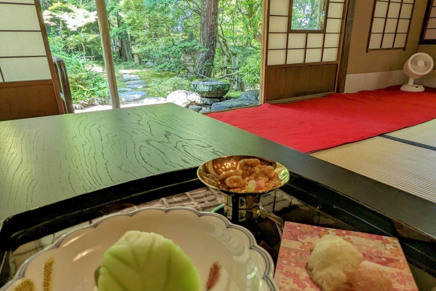 武家屋敷 寺島蔵人邸「乾泉亭」 :庭園を眺めながら、寺島家の家紋をかたどった特製の落雁とともに、画人の美意識に浸れます。