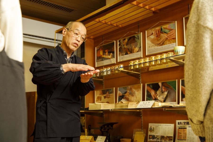 金の延べ棒を合金し、限界まで打ち延ばして1/10,000ミリメートルの薄さにする職人の技を間近に見学できます。