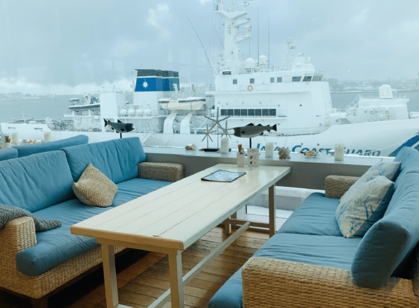 食堂の席からクルーズ船や海の景色を見ることができるほか、可愛い店内では海をイメージした食事を楽しむことができます。