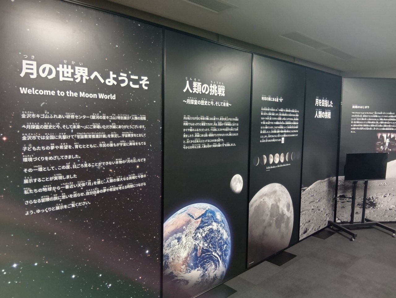 会場の金沢市教育プラザ富樫では、月の石、火星由来の隕石、宇宙服(レプリカ)、月の模擬砂などの展示を「見て」「触れて」「学べる」ほか、月面基地体験VRでは月面基地で過ごす体験もできます。
