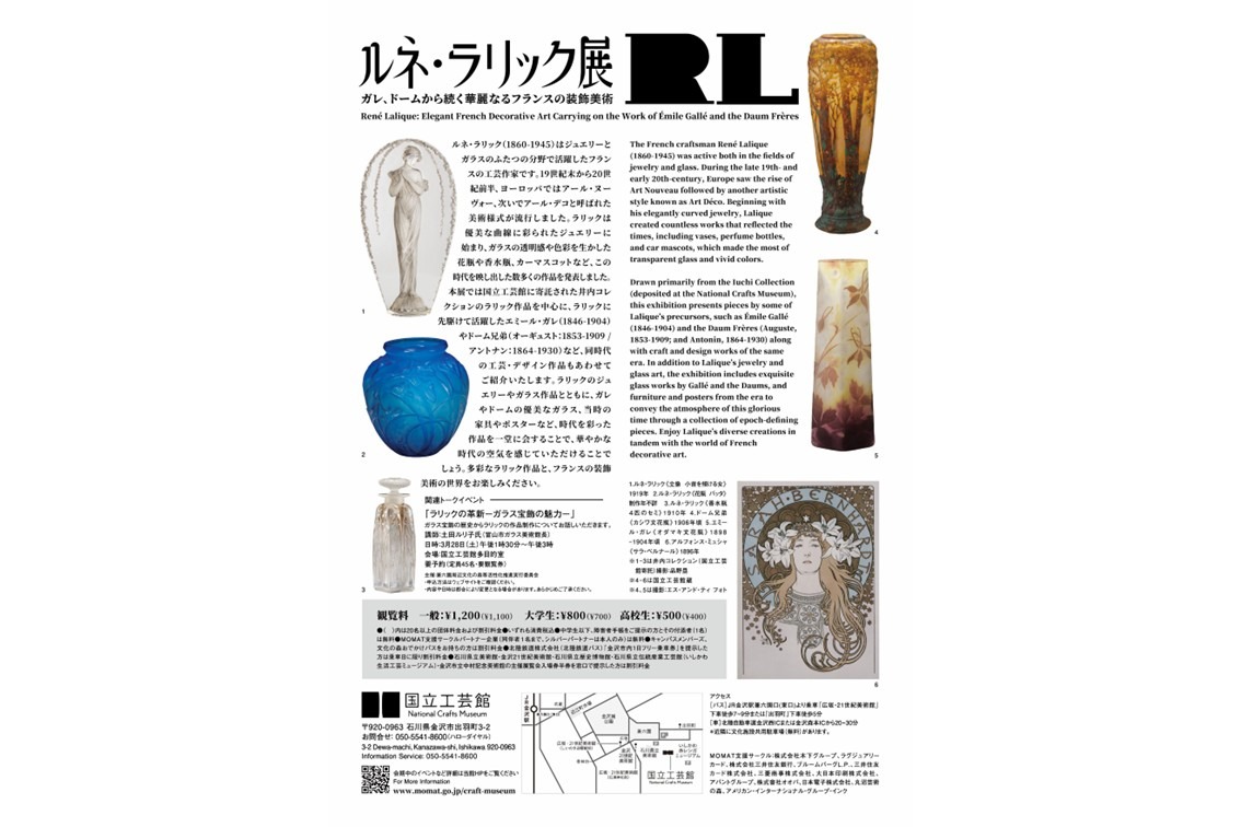 ルネ・ラリックは、アール・ヌーヴォー、アール・デコが流行した時代にジュエリーとガラス工芸の両面で活躍したフランスの作家です。本展では、国立工芸館に寄託された井内コレクションを中心に、ラリックが手がけた優美なジュエリーや色彩豊かなガラス作品を紹介します。さらに、同時代に活躍したエミール・ガレやドーム兄弟のガラス作品、当時の家具やポスターも展示し、装飾美術が華やかに花開いた時代の魅力をお愉しみください。