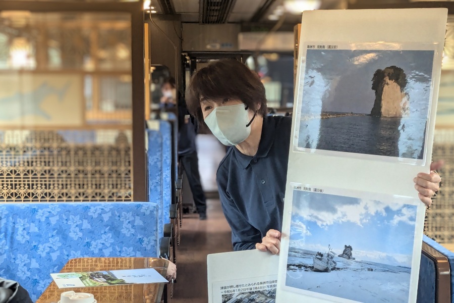 地元ガイドと「震災語り部観光列車」で「今!行ける能登」をご案内。桜の名所「能登鹿島駅」の桜、旬の牡蠣のフルコースを堪能。能登の魅力満喫のツアー(2025年企画)