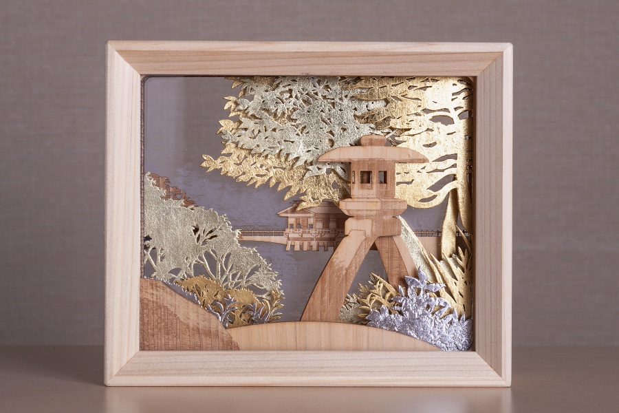 金沢の観光名所がデザインされて能登ヒバ製美しい金箔アートづくり