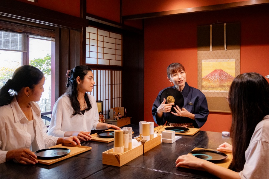ひがし茶屋街のギャラリー「金澤しつらえ」の情緒豊かな茶屋建築の空間で、貸切による熟練金箔職人による箔移し実演と金箔による工芸品の制作体験を行う。茶屋建築の説明もあり、ギャラリー内の石川県内の工芸品の鑑賞や購入もできるひがし茶屋街の特別体験。(2025年企画)