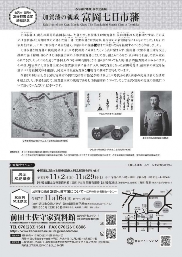 令和7年10月2日の金沢市・富岡市友好都市協定締結を記念して開催します。 加賀藩主家の親戚である七日市前田家について、そして金沢・加賀藩と富岡・七日市藩との交流の歴史について紹介します。