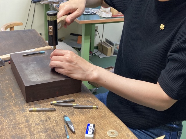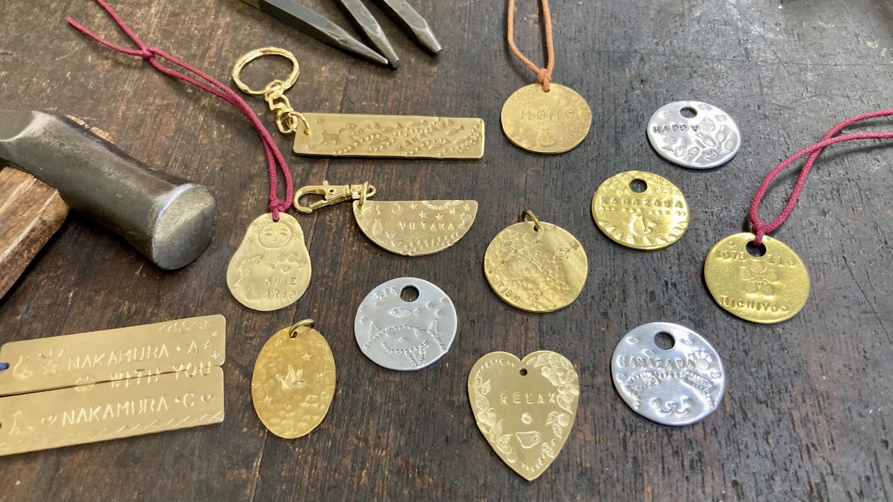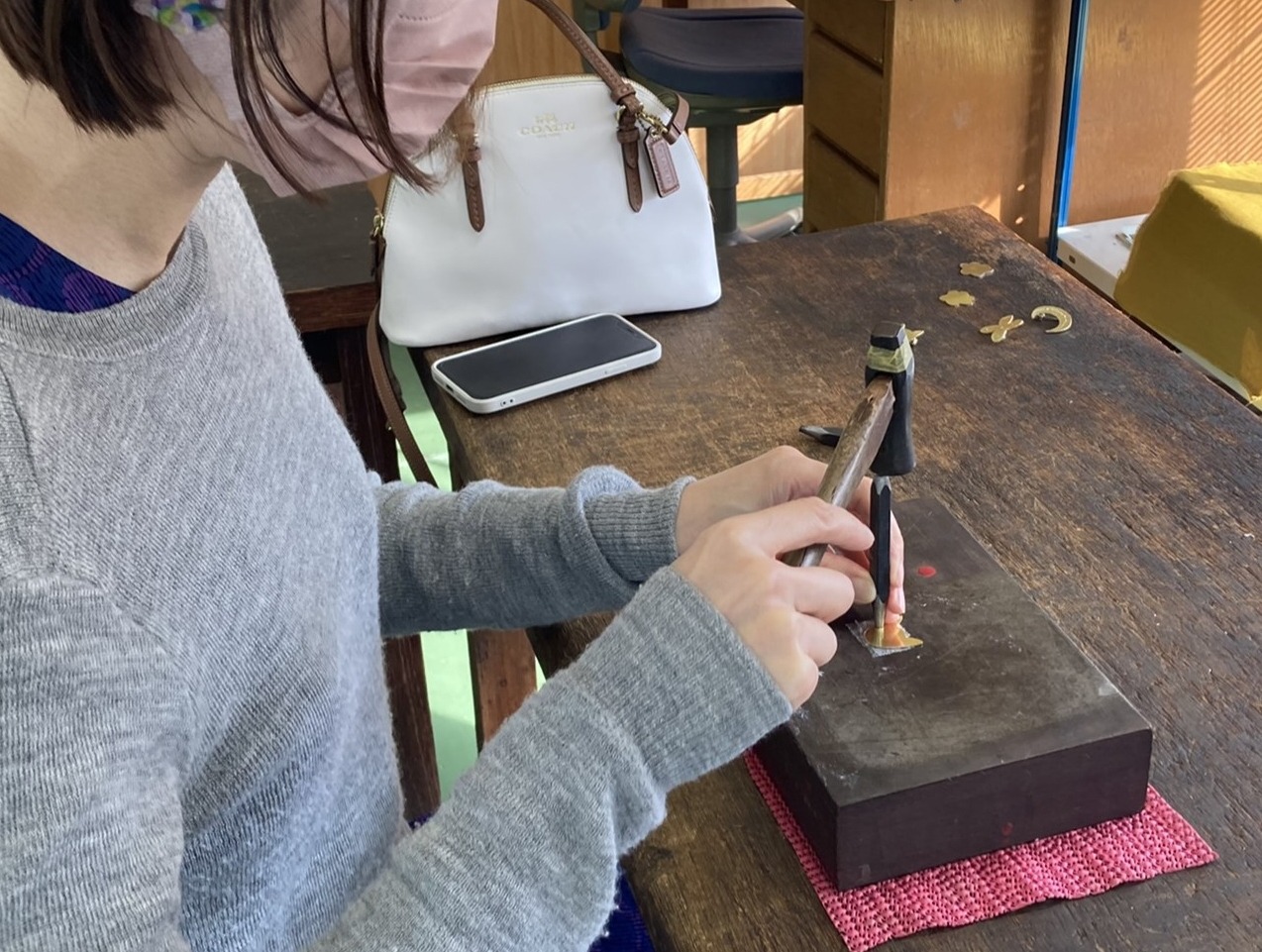 真鍮プレートに金槌と刻印で模様を付けること楽しむワークショップです。