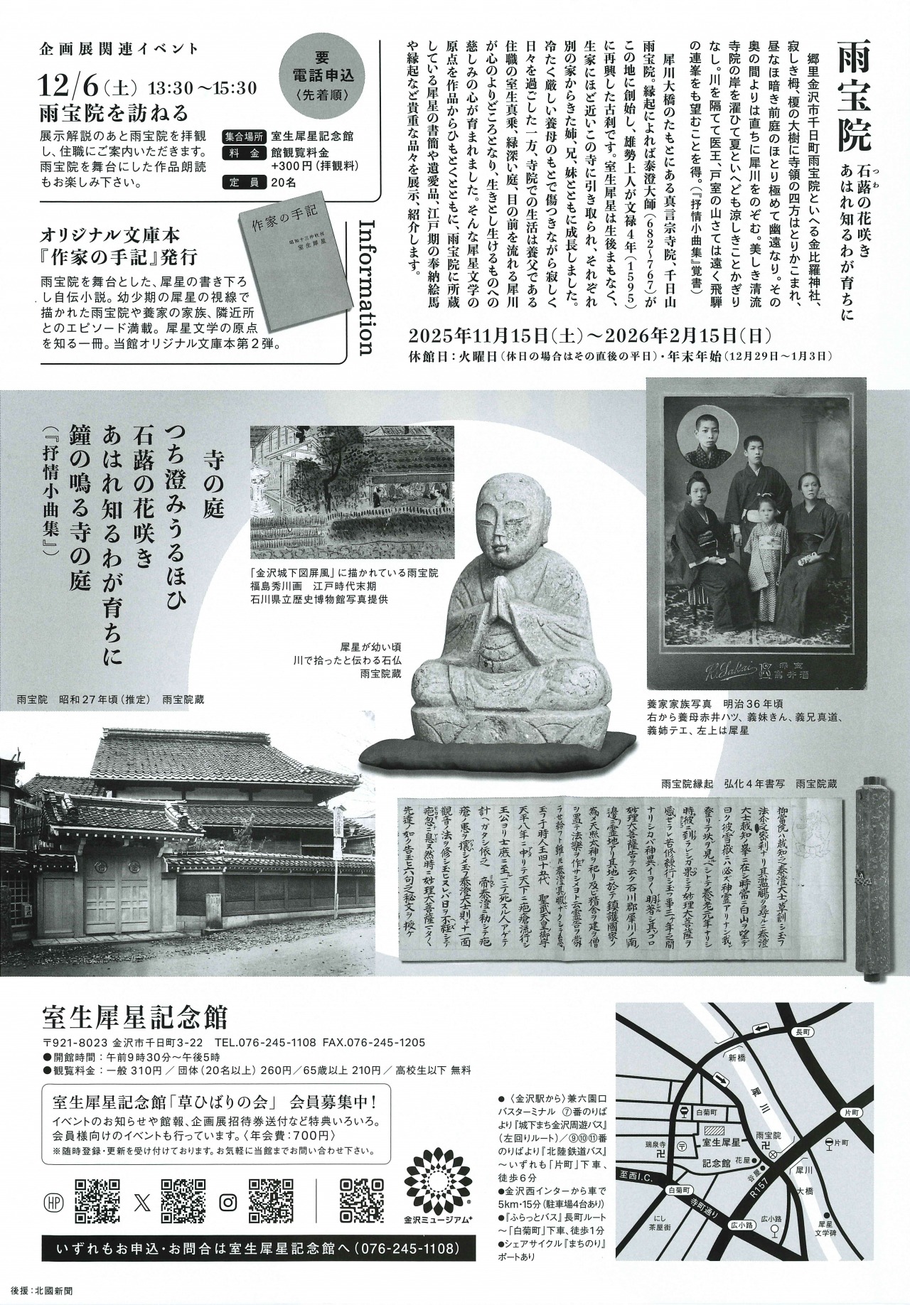 生後間もなく雨宝院に貰われた犀星が、ここでなにを覚え、感じ、成長していったのか、犀星文学の原点を、その作品からひもといていきます。