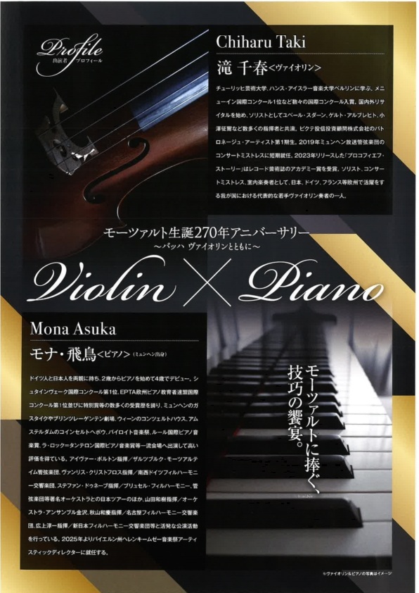 モーツァルトを深く愛し、その音楽を繊細さと美しさに加え、技巧をもって奏でるピアニストの一人、モナ・飛鳥氏と、圧倒的な技巧と豊かな音楽性で人々を魅了するヴァイオリニスト・滝千春氏を迎え、至極の演奏をお楽しみいただきます。