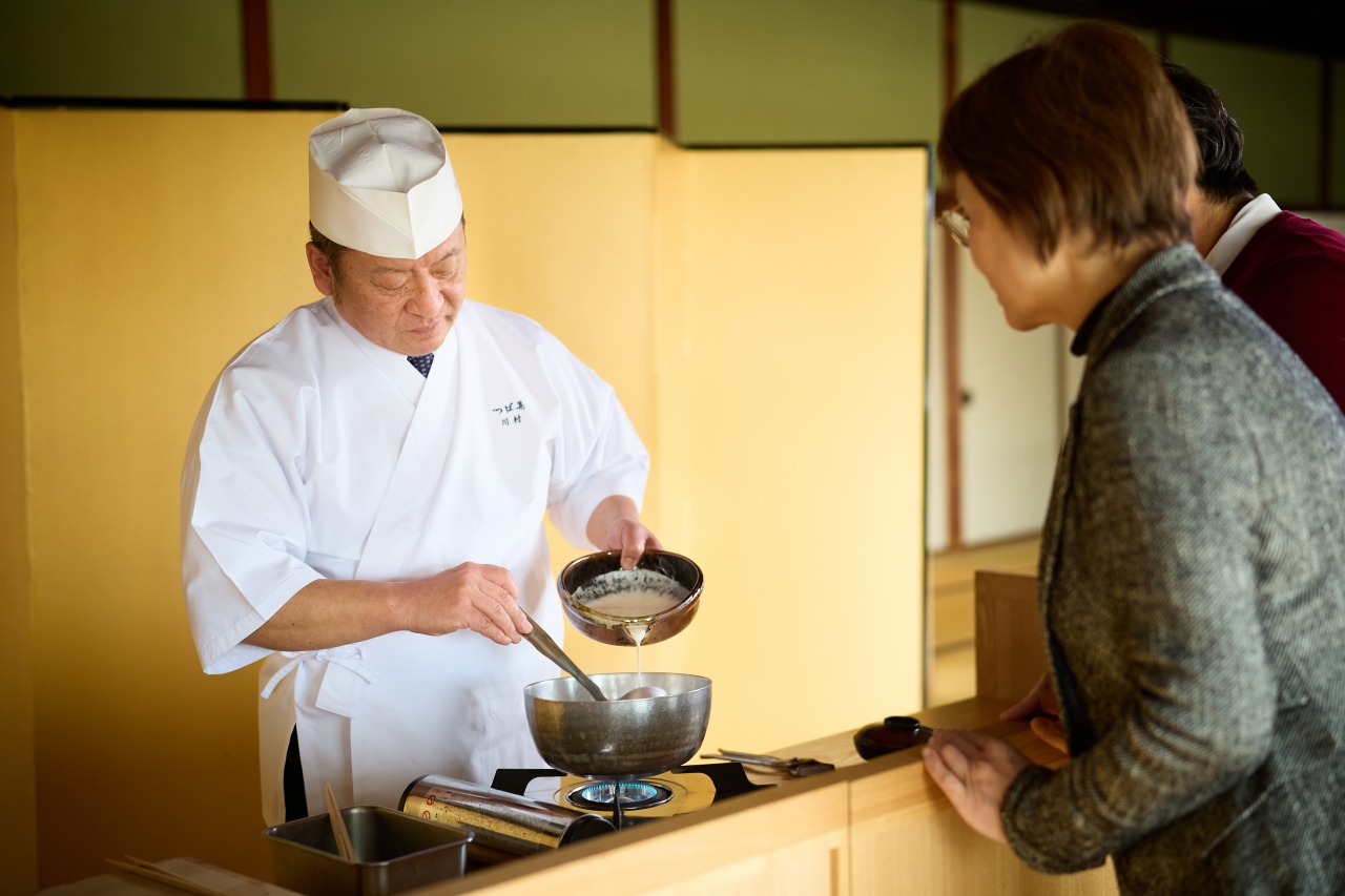 国の登録無形文化財に登録された加賀料理の真髄に触れる、特別な昼食プランをご用意しました。川村板長が器・食材・調理に込められた美意識を語りながら、代表的な加賀料理「治部煮(じぶに)」を目の前で仕上げます。実演の後は、熟練の技が光る特別コースをご堪能ください。器、しつらえ、おもてなし。長年守り続けてきた老舗の精神を、五感すべてで体感するひとときをお届けします。