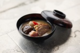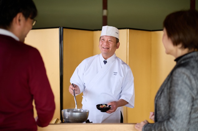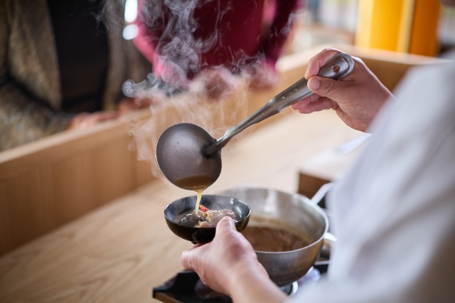 <料理実演> 加賀料理の代名詞「治部煮」を料理長が目の前で調理し、専用の「治部椀」へ盛り付けます。
