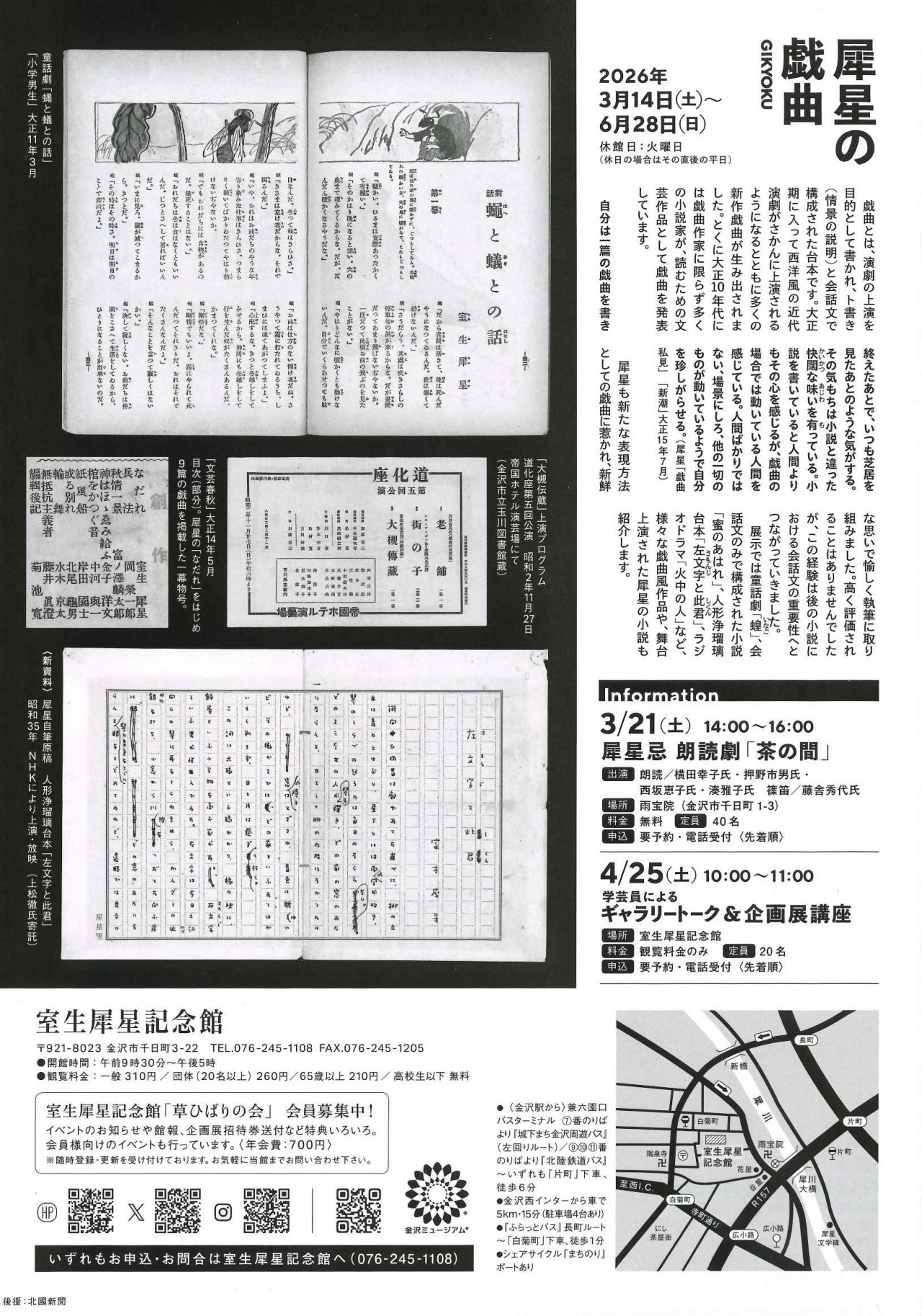 展示では童話劇、会話文のみで構成された小説、人形浄瑠璃台本、ラジオドラマなど、様々な戯曲風作品や、舞台上演された犀星の小説も紹介します。