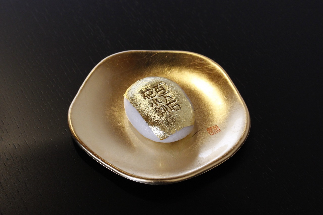 地元老舗和菓子店・清香室町様が本体験のために特別に製作した小判型まんじゅうに、お客様ご自身に金箔を貼って仕上げていただきます。
