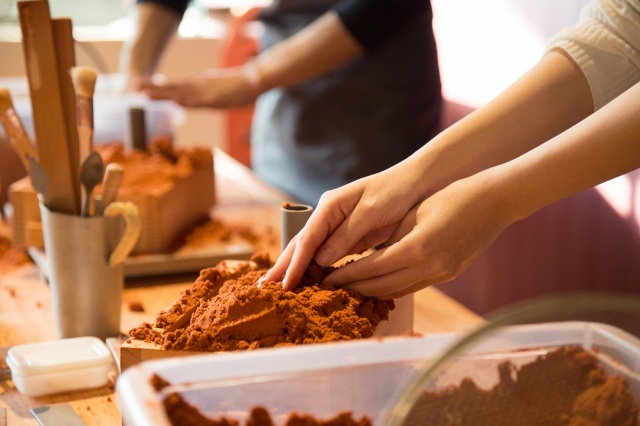生型鋳造法(なまがたちゅうぞうほう)という、砂を押し固めて鋳型を作る方法で、鋳肌や刻印に個性が光る錫(すず)の作品づくりを体験できます。
