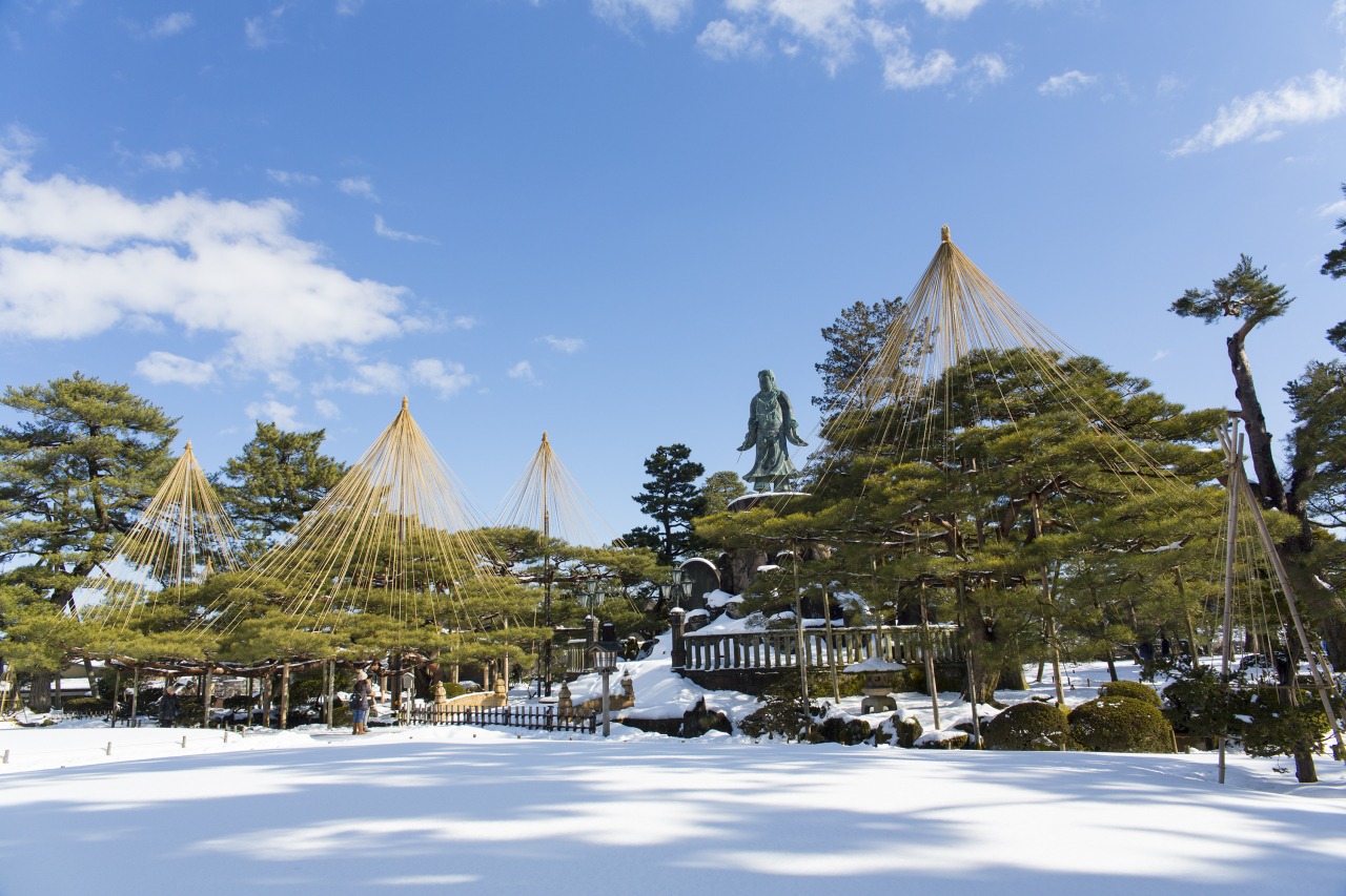 「兼六園」は、加賀藩歴代藩主が長い歳月をかけて築いた広大な回遊式大名庭園です。春の桜、夏の緑、秋の紅葉、冬の雪吊りなど、歴史と自然が織りなす四季の絶景を求めて、国内外から多くの観光客が訪れます。金沢城の隣に位置しているので、金沢城と兼六園を一緒に見学すると、加賀百万石の歴史を感じることができます。